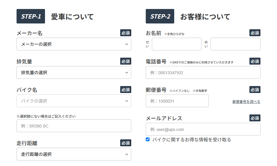 売却したいバイクの「メーカー名」「排気量」「バイク名」「走行距離」を選択・入力します。